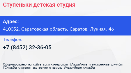 Ступеньки, детская студия по адресу 410052, Саратовская область, Саратов, Лунная, 46 в дальнейшем Организация, размещена в следующих категориях: