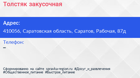 Толстяк, закусочная по адресу 410056, Саратовская область, Саратов, Рабочая, 87д в дальнейшем Организация, размещена в следующих категориях: