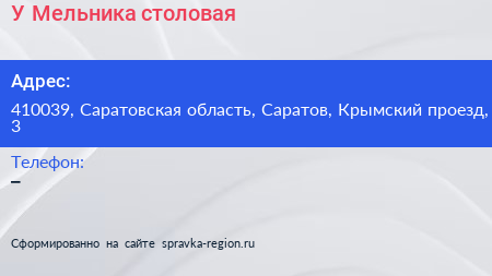 У Мельника, столовая по адресу 410039, Саратовская область, Саратов, Крымский проезд, 3 в дальнейшем Организация, размещена в следующих категориях: