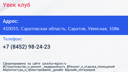 Увек, клуб по адресу 410055, Саратовская область, Саратов, Увекская, 108в в дальнейшем Организация, размещена в следующих категориях:
