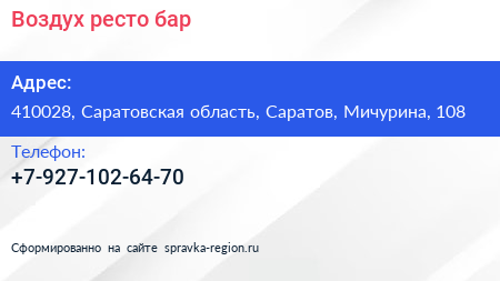 Воздух, ресто-бар по адресу 410028, Саратовская область, Саратов, Мичурина, 108 в дальнейшем Организация, размещена в следующих категориях: