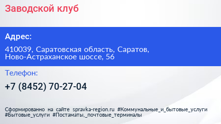 Заводской, клуб по адресу 410039, Саратовская область, Саратов, Ново-Астраханское шоссе, 56 в дальнейшем Организация, размещена в следующих категориях: