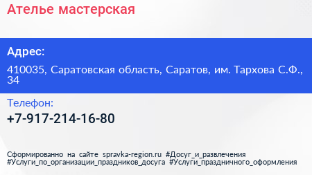 Ателье-мастерская по адресу 410035, Саратовская область, Саратов, им. Тархова С.Ф., 34 в дальнейшем Организация, размещена в следующих категориях: