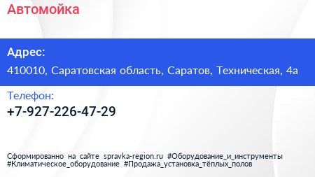Автомойка по адресу 410010, Саратовская область, Саратов, Техническая, 4а в дальнейшем Организация, размещена в следующих категориях: