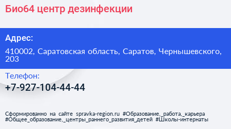 Био64, центр дезинфекции по адресу 410002, Саратовская область, Саратов, Чернышевского, 203 в дальнейшем Организация, размещена в следующих категориях: