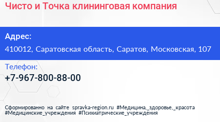 Чисто и Точка, клининговая компания по адресу 410012, Саратовская область, Саратов, Московская, 107 в дальнейшем Организация, размещена в следующих категориях: