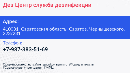 Дез-Центр, служба дезинфекции по адресу 410031, Саратовская область, Саратов, Чернышевского, 223/231 в дальнейшем Организация, размещена в следующих категориях: