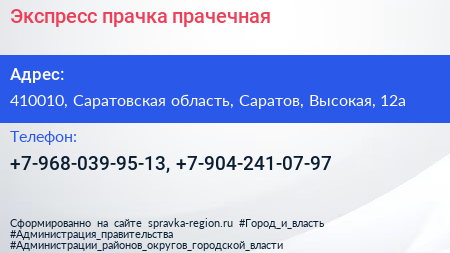 Экспресс прачка, прачечная по адресу 410010, Саратовская область, Саратов, Высокая, 12а в дальнейшем Организация, размещена в следующих категориях: