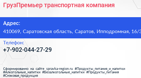 ГрузПремьер, транспортная компания по адресу 410069, Саратовская область, Саратов, Ипподромная, 16/3 в дальнейшем Организация, размещена в следующих категориях: