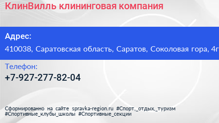 КлинВилль, клининговая компания по адресу 410038, Саратовская область, Саратов, Соколовая гора, 4г в дальнейшем Организация, размещена в следующих категориях: