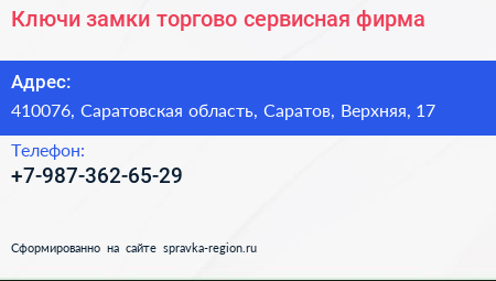 Ключи-замки, торгово-сервисная фирма по адресу 410076, Саратовская область, Саратов, Верхняя, 17 в дальнейшем Организация, размещена в следующих категориях: