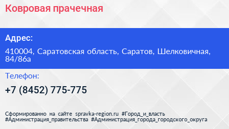 Ковровая прачечная по адресу 410004, Саратовская область, Саратов, Шелковичная, 84/86а в дальнейшем Организация, размещена в следующих категориях: