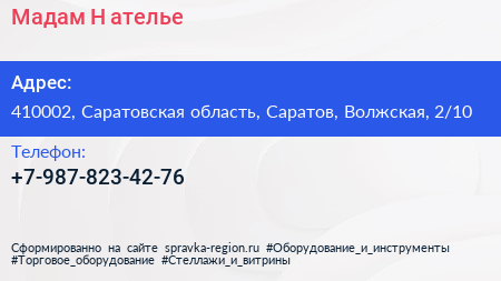 Мадам-Н, ателье по адресу 410002, Саратовская область, Саратов, Волжская, 2/10 в дальнейшем Организация, размещена в следующих категориях: