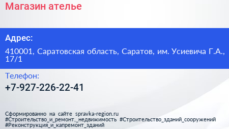 Магазин-ателье по адресу 410001, Саратовская область, Саратов, им. Усиевича Г.А., 17/1 в дальнейшем Организация, размещена в следующих категориях: