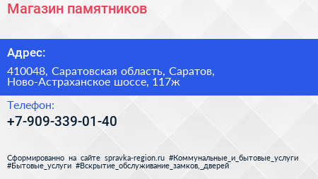 Магазин памятников по адресу 410048, Саратовская область, Саратов, Ново-Астраханское шоссе, 117ж в дальнейшем Организация, размещена в следующих категориях: