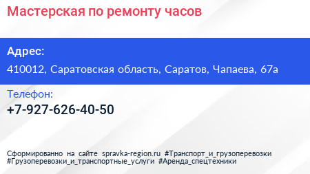 Мастерская по ремонту часов по адресу 410012, Саратовская область, Саратов, Чапаева, 67а в дальнейшем Организация, размещена в следующих категориях: