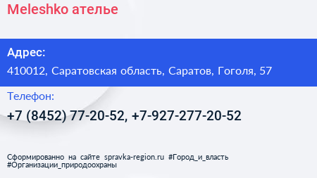 Meleshko, ателье по адресу 410012, Саратовская область, Саратов, Гоголя, 57 в дальнейшем Организация, размещена в следующих категориях: