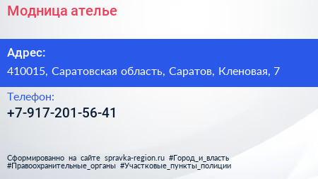 Модница, ателье по адресу 410015, Саратовская область, Саратов, Кленовая, 7 в дальнейшем Организация, размещена в следующих категориях: