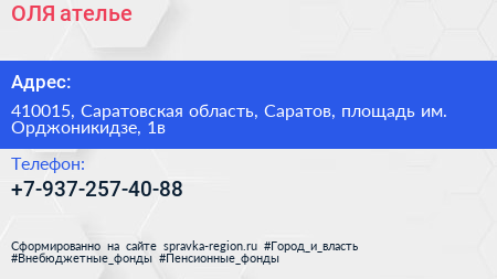 ОЛЯ, ателье по адресу 410015, Саратовская область, Саратов, площадь им. Орджоникидзе, 1в в дальнейшем Организация, размещена в следующих категориях: