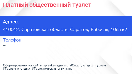 Платный общественный туалет по адресу 410012, Саратовская область, Саратов, Рабочая, 106а к2 в дальнейшем Организация, размещена в следующих категориях:
