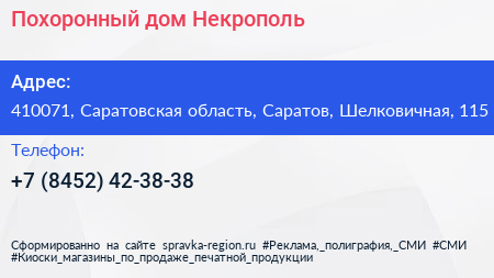 Похоронный дом Некрополь по адресу 410071, Саратовская область, Саратов, Шелковичная, 115 в дальнейшем Организация, размещена в следующих категориях: