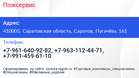 Пожсервис по адресу 410005, Саратовская область, Саратов, Пугачёва, 161 в дальнейшем Организация, размещена в следующих категориях: