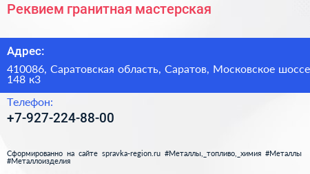 Реквием, гранитная мастерская по адресу 410086, Саратовская область, Саратов, Московское шоссе, 148 к3 в дальнейшем Организация, размещена в следующих категориях: