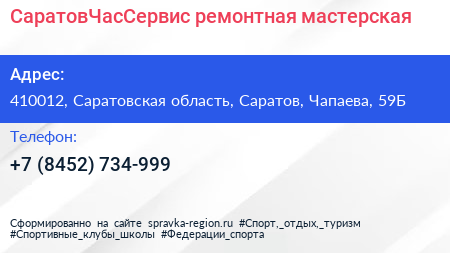 СаратовЧасСервис, ремонтная мастерская по адресу 410012, Саратовская область, Саратов, Чапаева, 59Б в дальнейшем Организация, размещена в следующих категориях: