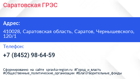 Саратовская ГРЭС по адресу 410028, Саратовская область, Саратов, Чернышевского, 120/1 в дальнейшем Организация, размещена в следующих категориях: