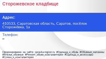 Сторожевское кладбище по адресу 410533, Саратовская область, Саратов, посёлок Сторожёвка, 1а в дальнейшем Организация, размещена в следующих категориях: