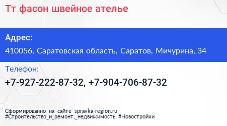 Тт фасон, швейное ателье по адресу 410056, Саратовская область, Саратов, Мичурина, 34 в дальнейшем Организация, размещена в следующих категориях: