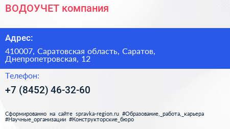 ВОДОУЧЕТ, компания по адресу 410007, Саратовская область, Саратов, Днепропетровская, 12 в дальнейшем Организация, размещена в следующих категориях: