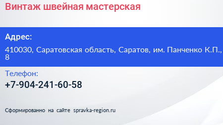 Винтаж, швейная мастерская по адресу 410030, Саратовская область, Саратов, им. Панченко К.П., 8 в дальнейшем Организация, размещена в следующих категориях: