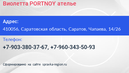 Виолетта & PORTNOY, ателье по адресу 410056, Саратовская область, Саратов, Чапаева, 14/26 в дальнейшем Организация, размещена в следующих категориях: