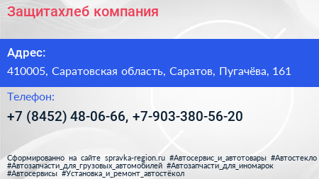 Защитахлеб, компания по адресу 410005, Саратовская область, Саратов, Пугачёва, 161 в дальнейшем Организация, размещена в следующих категориях:
