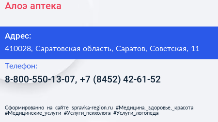 Алоэ, аптека по адресу 410028, Саратовская область, Саратов, Советская, 11 в дальнейшем Организация, размещена в следующих категориях: