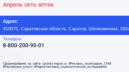 Апрель, сеть аптек по адресу 410071, Саратовская область, Саратов, Шелковичная, 182а в дальнейшем Организация, размещена в следующих категориях: