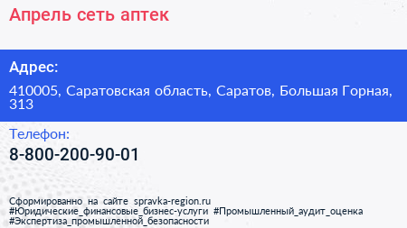 Апрель, сеть аптек по адресу 410005, Саратовская область, Саратов, Большая Горная, 313 в дальнейшем Организация, размещена в следующих категориях: