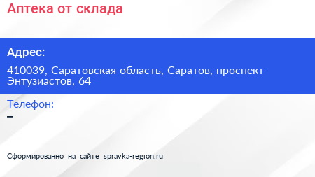 Аптека от склада по адресу 410039, Саратовская область, Саратов, проспект Энтузиастов, 64 в дальнейшем Организация, размещена в следующих категориях: