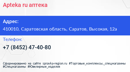 Apteka.ru, аптека по адресу 410010, Саратовская область, Саратов, Высокая, 12а в дальнейшем Организация, размещена в следующих категориях: