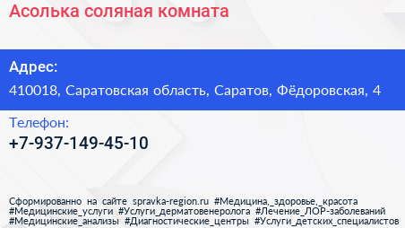 Асолька, соляная комната по адресу 410018, Саратовская область, Саратов, Фёдоровская, 4 в дальнейшем Организация, размещена в следующих категориях: