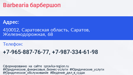 Barbearia, барбершоп по адресу 410012, Саратовская область, Саратов, Железнодорожная, 68 в дальнейшем Организация, размещена в следующих категориях: