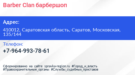 Barber Clan, барбершоп по адресу 410012, Саратовская область, Саратов, Московская, 135/144 в дальнейшем Организация, размещена в следующих категориях: