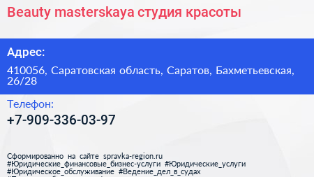 Beauty.masterskaya, студия красоты по адресу 410056, Саратовская область, Саратов, Бахметьевская, 26/28 в дальнейшем Организация, размещена в следующих категориях: