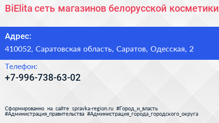 BiElita, сеть магазинов белорусской косметики по адресу 410052, Саратовская область, Саратов, Одесская, 2 в дальнейшем Организация, размещена в следующих категориях:
