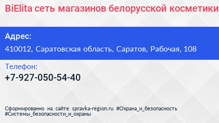 BiElita, сеть магазинов белорусской косметики по адресу 410012, Саратовская область, Саратов, Рабочая, 108 в дальнейшем Организация, размещена в следующих категориях: