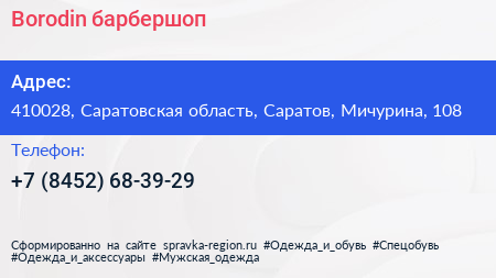 Borodin, барбершоп по адресу 410028, Саратовская область, Саратов, Мичурина, 108 в дальнейшем Организация, размещена в следующих категориях: