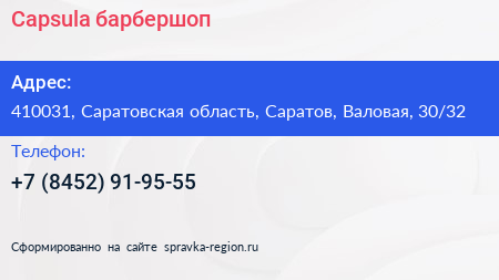 Capsula, барбершоп по адресу 410031, Саратовская область, Саратов, Валовая, 30/32 в дальнейшем Организация, размещена в следующих категориях: