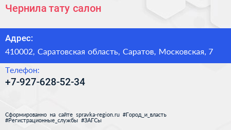Чернила, тату-салон по адресу 410002, Саратовская область, Саратов, Московская, 7 в дальнейшем Организация, размещена в следующих категориях: