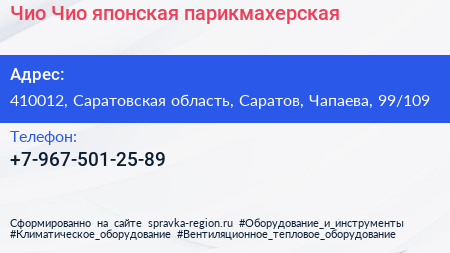 Чио Чио, японская парикмахерская по адресу 410012, Саратовская область, Саратов, Чапаева, 99/109 в дальнейшем Организация, размещена в следующих категориях:
